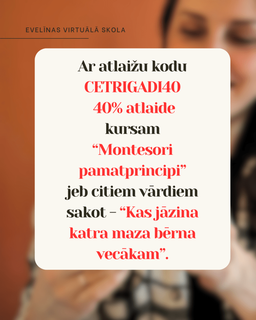1⃣ Ar atlaižu kodu CETRIGADI40 Tev 3 dienas (līdz 12.04. pl. 23.59) ir iespēja iegādāties kursu “Montesori pamatprincipi” ar 40% atlaidi – https://evelinas-virtuala-skola.thinkific.com/courses/Montesori-pamatprincipi! Kurss pēc to iegādes ir pieejams 6 mēnešus.