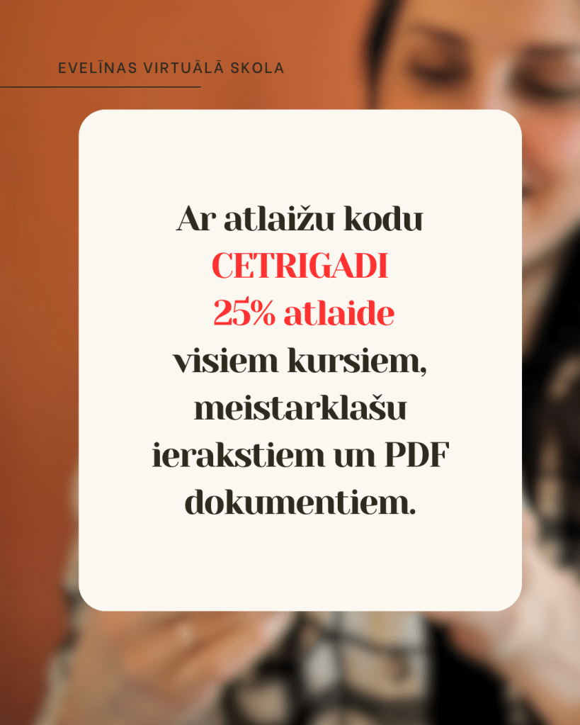 2⃣ Ar atlaižu kodu CETRIGADI Tev 3 dienas ir iespēja iegādāties visus kursus, meistarklases un PDF ar 25% atlaidi – https://evelinas-virtuala-skola.thinkific.com/collections.